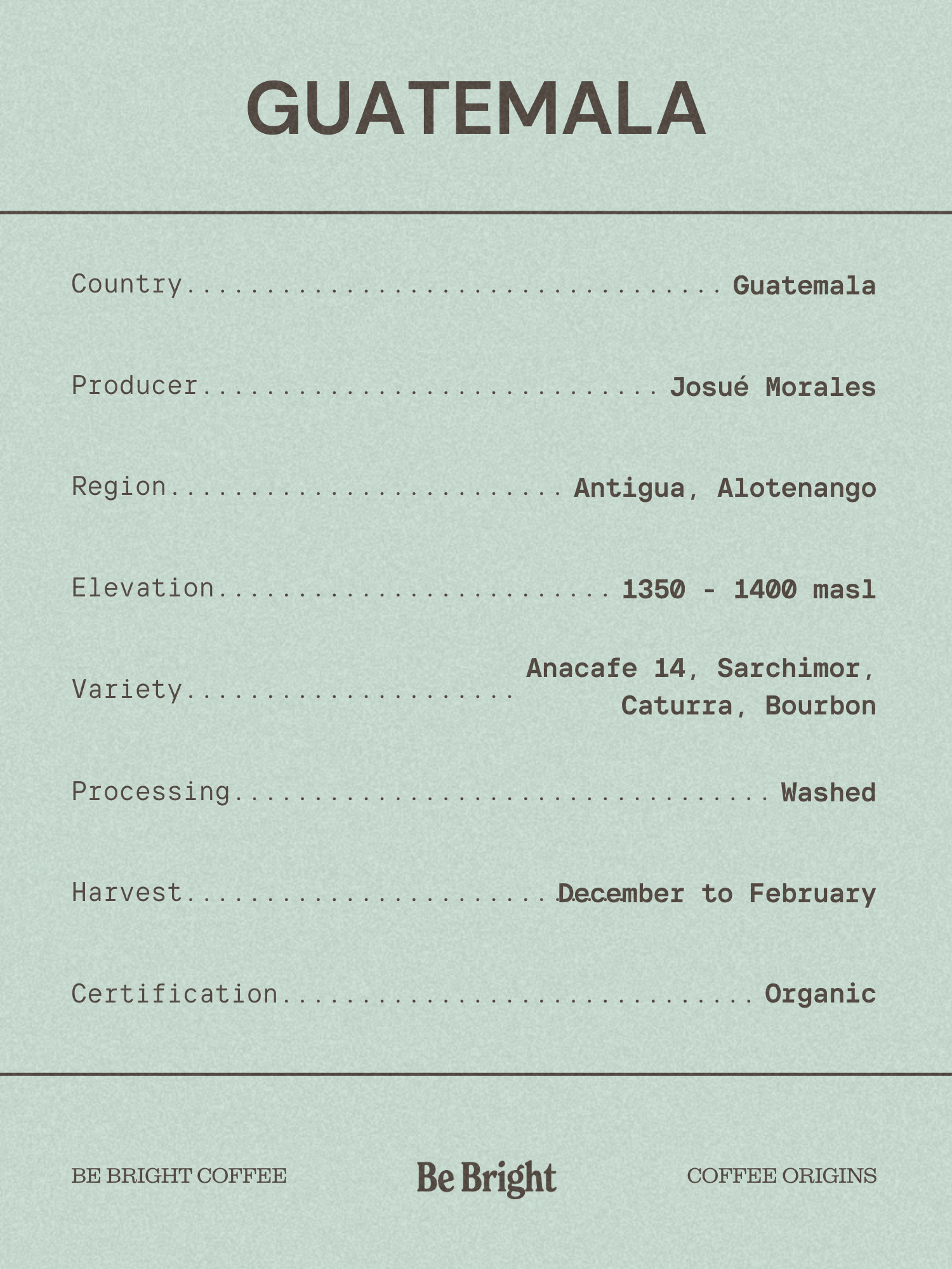 The Anacafe 14 varietal constitutes the majority of the current planted area on the farm. This is a 5th and 6th generation Anacafe 14, and it is typically picked and then dry fermented for 36 hours before it is washed. Drying on this farm takes 21 days. We're really excited to bring this coffee back this year and share with you all the fruits of the labor of the team at Los Volcanes. We’re excited for you to try this delicious organic coffee again.